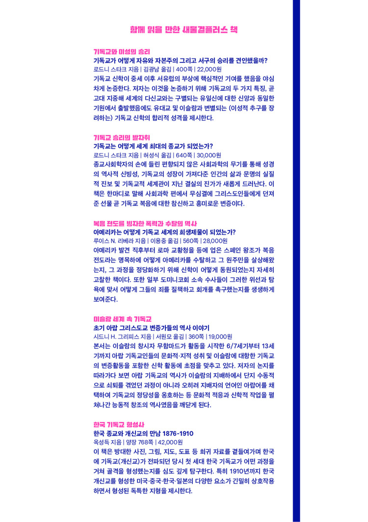 기독교의 역사를 둘러싼 통념적 상식에 야심 찬 도전장을 내밀었던 로드니 스타크가 『기독교 승리의 발자취』(2020)를 통해 새물결플러스의 독자들과 첫 팬 미팅을 나눈 이래로, 『기독교와 이성의 승리』(2021)를 거쳐 『서구는 어떻게 역사의 승자가 되었는가?』(2022)에 이르기까지 벌써 세 차례의 만남을 이어오고 있다. 스타크의 이 3부작(trilogy)은 기독교 문명이라는 역사적 대상을 바라보는 삼차원적 입체시(立體視)를 열어준다. 이 3D 퍼즐의 나머지 조각을 놓을 때 현전(現前)하게 될 실체가 자못 기대된다.