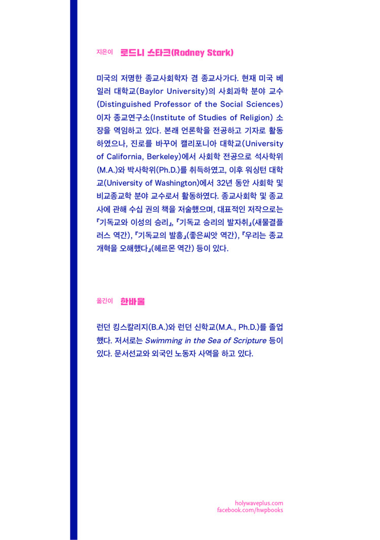 본서는 종교사회학자인 스타크의 이전 저술들을 총망라하여 서구 기독교의 발흥과 영향에 관한 참신한 시각으로 역사와 문명 다시 보기를 시도한다. 기독교와 서구 사상 그리고 과학이 가져온 근대와 세계화, 그리고 그것이 초래한 발전과 진보의 다양한 역사 속의 이야기를 접하는 즐거움을 원하는 독자들에게 일독을 권한다.