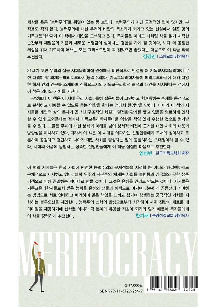 21세기 초반 우리의 삶을 사회윤리학적 관점에서 비판적으로 반성할 때 기독교사회윤리학이 우선 다뤄야 할 과제는 메리토크라시(능력주의)다. 기독교윤리학자들이 메리토크라시에 대해 다양한 학제 간의 연구를 소개하며 신학으로서의 기독교윤리학적 해석과 대안을 제시했다는 점에서 이 책은 의미와 가치를 지닌다. 무엇보다 이 책은 이 시대 우리 사회, 특히 젊은이들이 고민하고 힘겨워하는 주제를 통전적으로 분석하고 이해할 수 있도록 돕는 역할을 한다는 점에서 환영받을 만하다. 나아가 이 책의 저자들은 개인적 삶의 문제가 곧 사회구조적인 차원과 밀접한 관계를 맺고 있음을 명료하게 인식할 수 있게 도와준다는 점에서 기독교윤리학자들다운 역할을 책임 있게 수행한 것으로 평가받을 수 있다. 그들은 주제에 대한 분석과 이해를 넘어 성서적 비전에 근거한 대안 사회의 내용과 방향성을 제시하고 있다. 따라서 이 책은 이 시대를 아파하는 신앙인들에게 독서에 참여하고 토론하며 공감하고 결단하고 나아가 대안 사회를 형성하는 일에 동참하라는 초대장이라 할 수 있다. 시대의 아픔에 동참하는 성숙한 신앙인들에게 이 책을 절절한 마음으로 추천한다.
