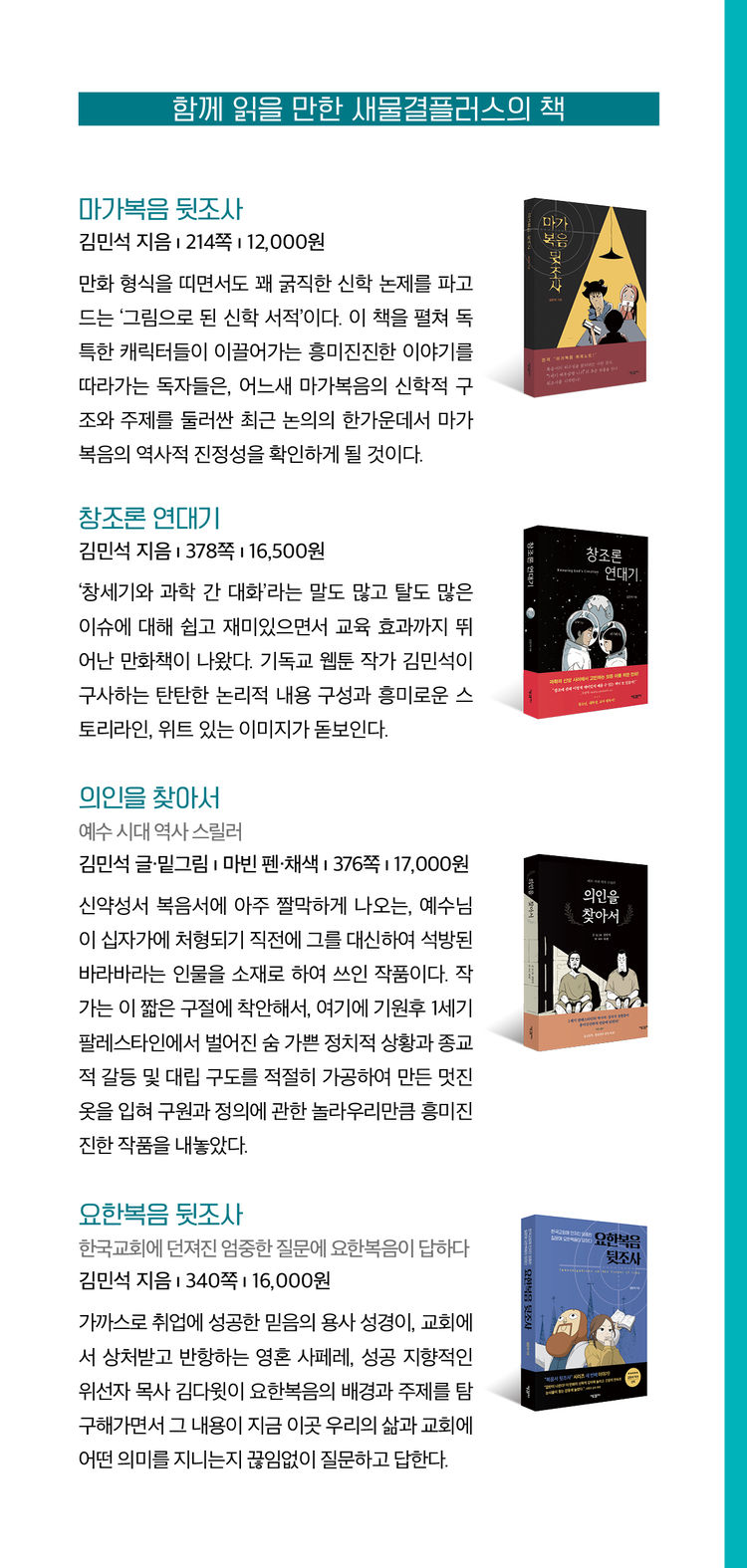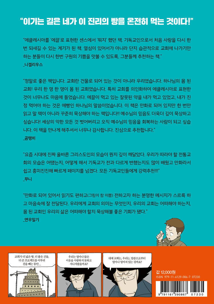 “정말로 좋은 책입니다. 교회란 건물로 되어 있는 것이 아니라 우리였습니다. 하나님의 몸 된 교회! 우리 한 명 한 명이 몸 된 교회였습니다. 특히 교회를 의인화하여 에클레시아로 표현한 것이 너무나도 마음에 들었습니다. 에끌이 먹고 있는 잘못된 약을 내가 먹고 있었고, 내가 진정 먹어야 하는 것은 에빵인 하나님의 말씀이었습니다. 이 책은 만화로 되어 있지만 한 번만 읽고 말 책이 아니라 꾸준히 묵상해야 하는 책입니다!! 예수님의 믿음도 더욱더 깊이 묵상하고 싶습니다! 세상의 악한 모든 것 벗어버리고 오직 예수님의 믿음을 회복하는 사람이 되고 싶습니다. 이 책을 만나게 해주셔서 너무나 감사합니다. 진심으로 추천합니다.”
