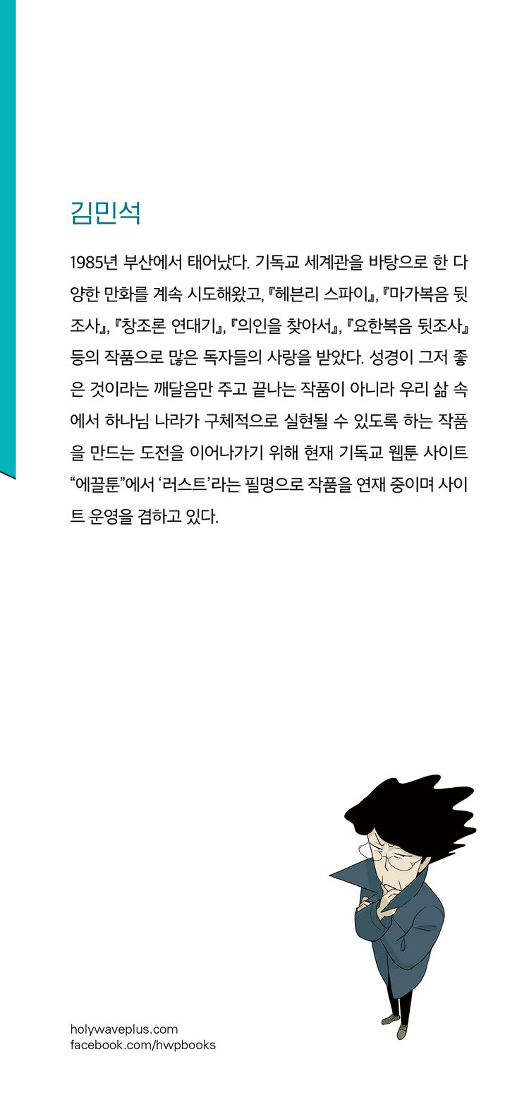 1985년 부산에서 태어났다. 기독교 세계관을 바탕으로 한 다양한 만화를 계속 시도해왔고, 『헤븐리 스파이』, 『마가복음 뒷조사』, 『창조론 연대기』, 『의인을 찾아서』, 『요한복음 뒷조사』 등의 작품으로 많은 독자들의 사랑을 받았다. 성경이 그저 좋은 것이라는 깨달음만 주고 끝나는 작품이 아니라 우리 삶 속에서 하나님 나라가 구체적으로 실현될 수 있도록 하는 작품을 만드는 도전을 이어나가기 위해 현재 기독교 웹툰 사이트 “에끌툰”에서 ‘러스트’라는 필명으로 작품을 연재 중이며 사이트 운영을 겸하고 있다.