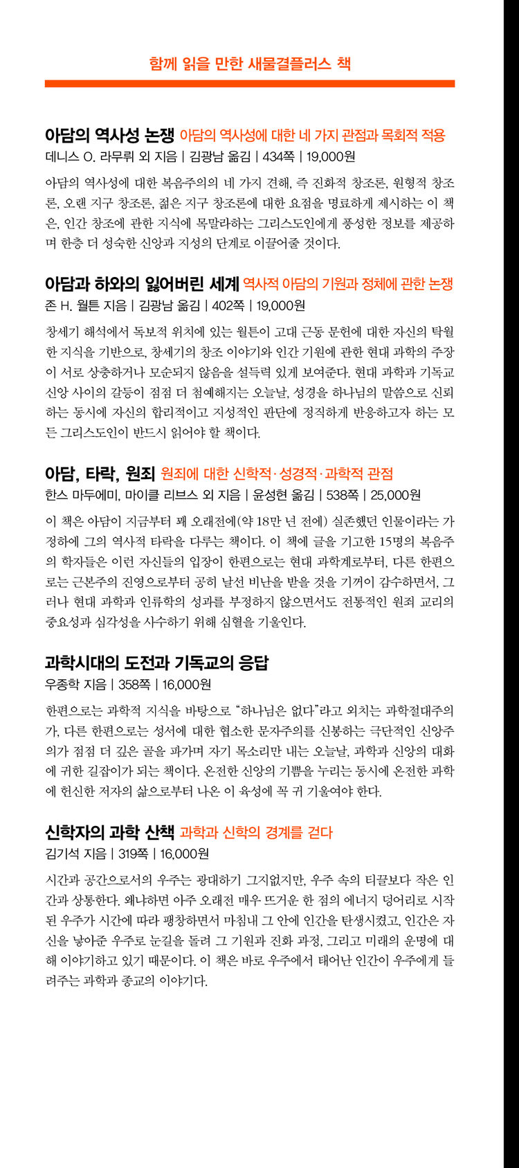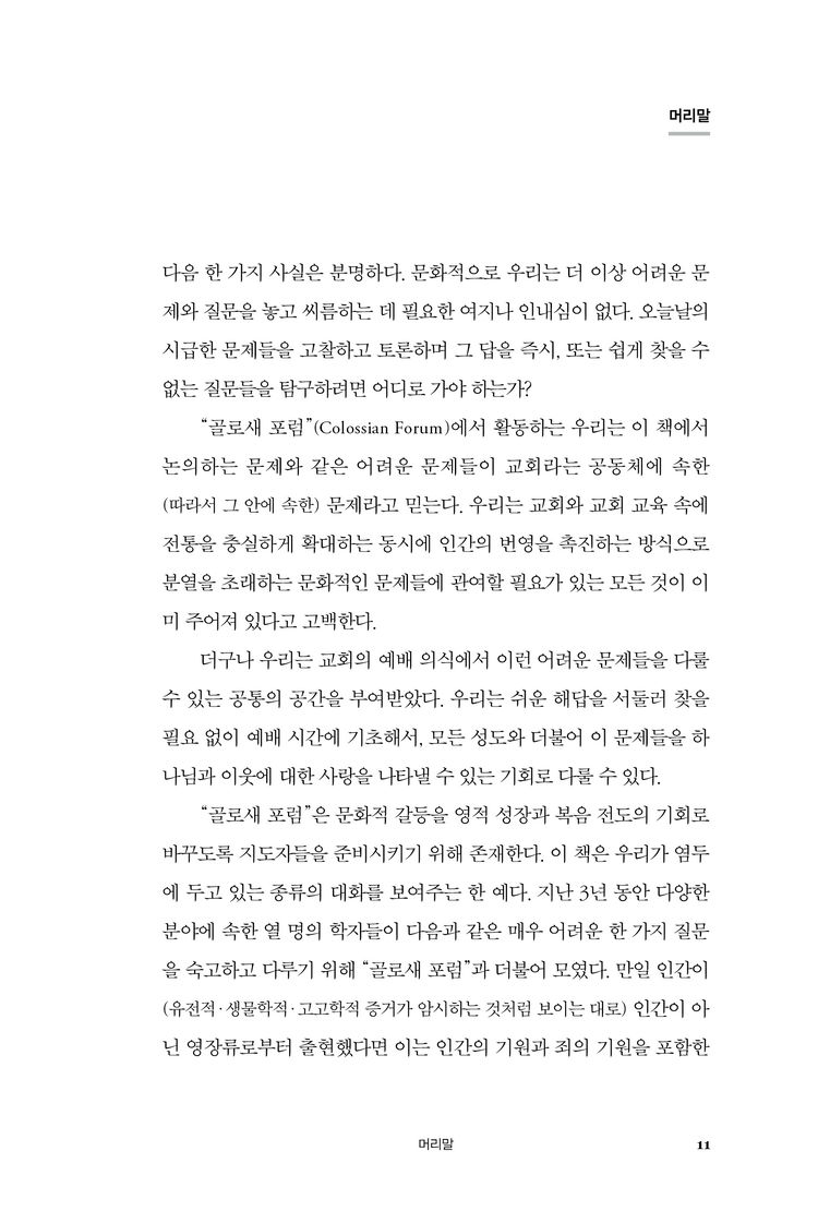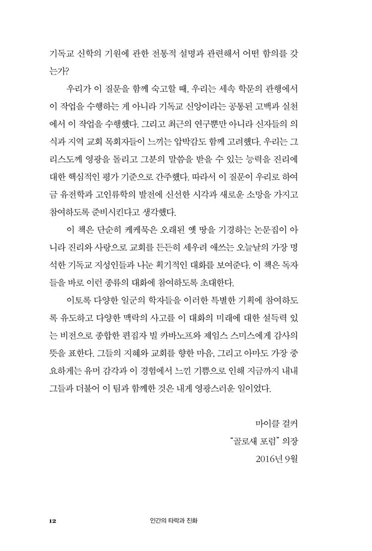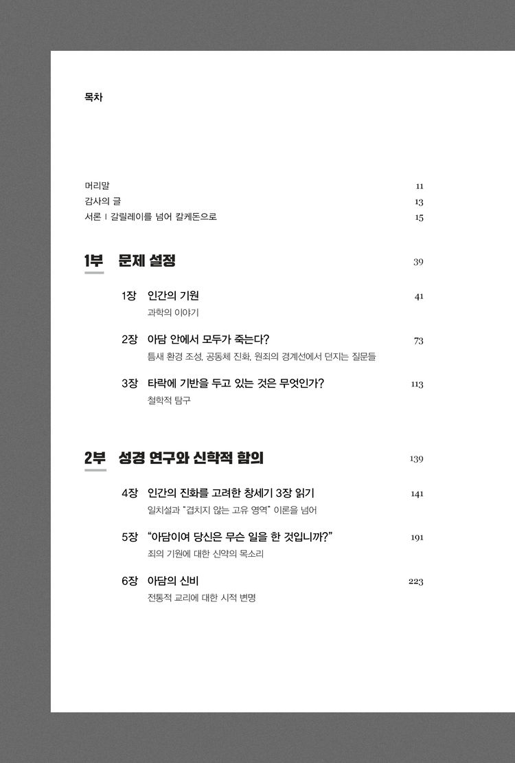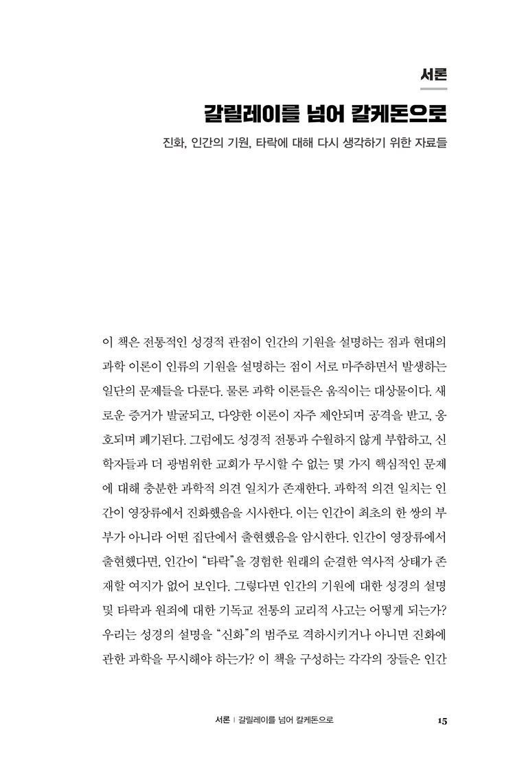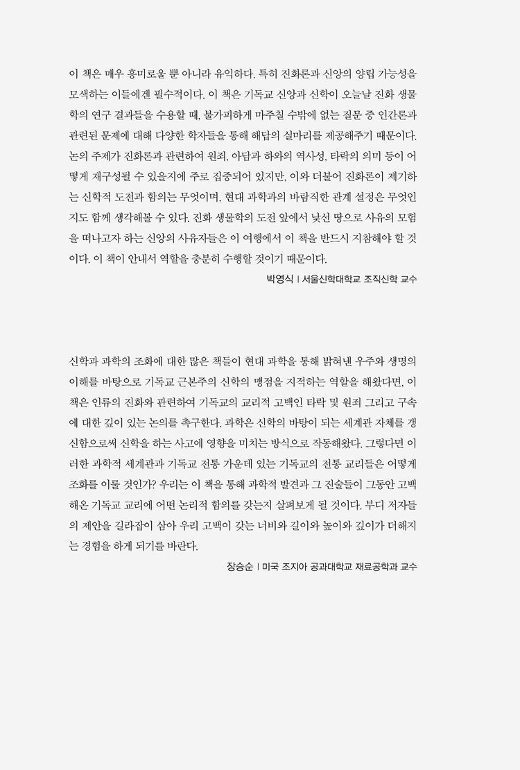 이 책은 인류의 진화와 관련하여 기독교의 교리적 고백인 타락 및 원죄 그리고 구속에 대한 깊이 있는 논의를 촉구한다. 우리는 이 책을 통해 과학적 발견과 그 진술들이 그동안 고백해온 기독교 교리에 어떤 논리적 함의를 갖는지 살펴보게 될 것이다. 부디 저자들의 제안을 길라잡이 삼아 우리 고백이 갖는 너비와 길이와 높이와 깊이가 더해지는 경험을 하게 되기를 바란다.