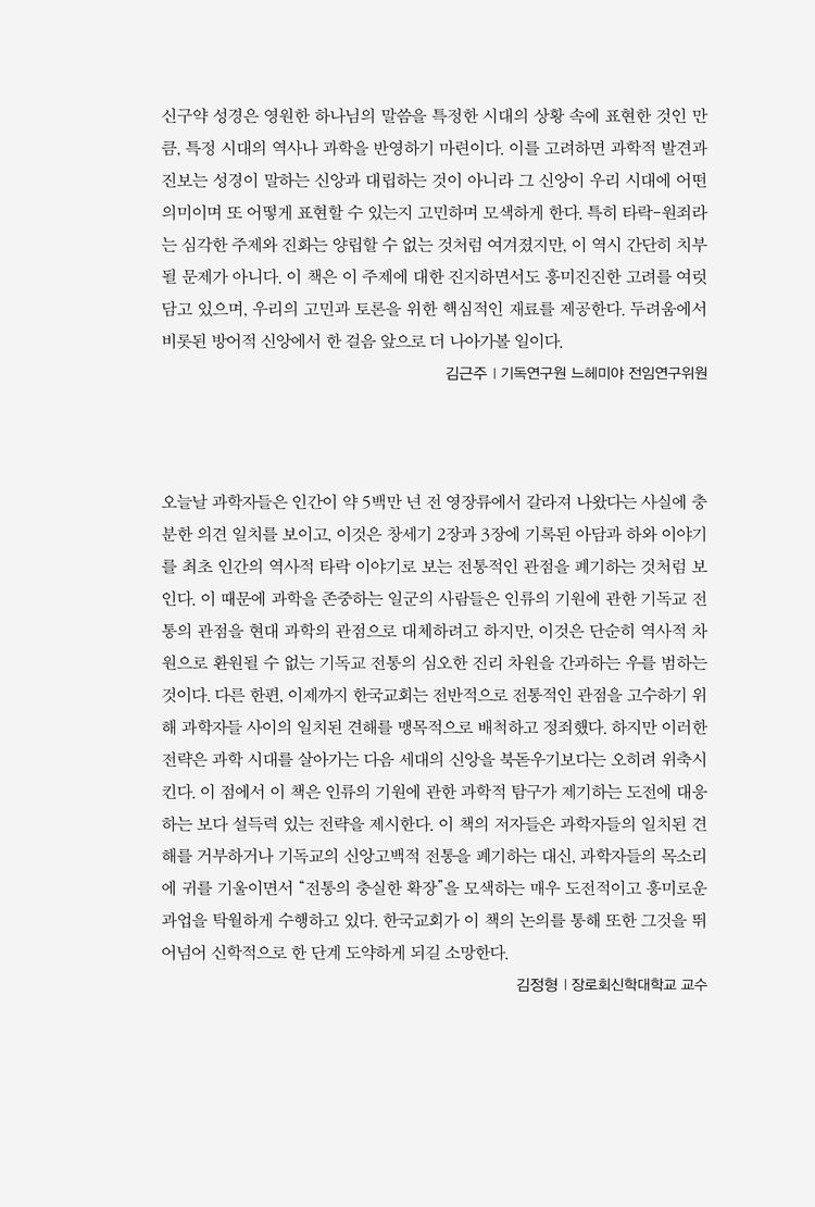 이 책은 인류의 기원에 관한 과학적 탐구가 제기하는 도전에 대응하는 보다 설득력 있는 전략을 제시한다. 이 책의 저자들은 과학자들의 일치된 견해를 거부하거나 기독교의 신앙고백적 전통을 폐기하는 대신, 과학자들의 목소리에 귀를 기울이면서 “전통의 충실한 확장”을 모색하는 매우 도전적이고 흥미로운 과업을 탁월하게 수행하고 있다. 한국교회가 이 책의 논의를 통해 또한 그것을 뛰어넘어 신학적으로 한 단계 도약하게 되길 소망한다.