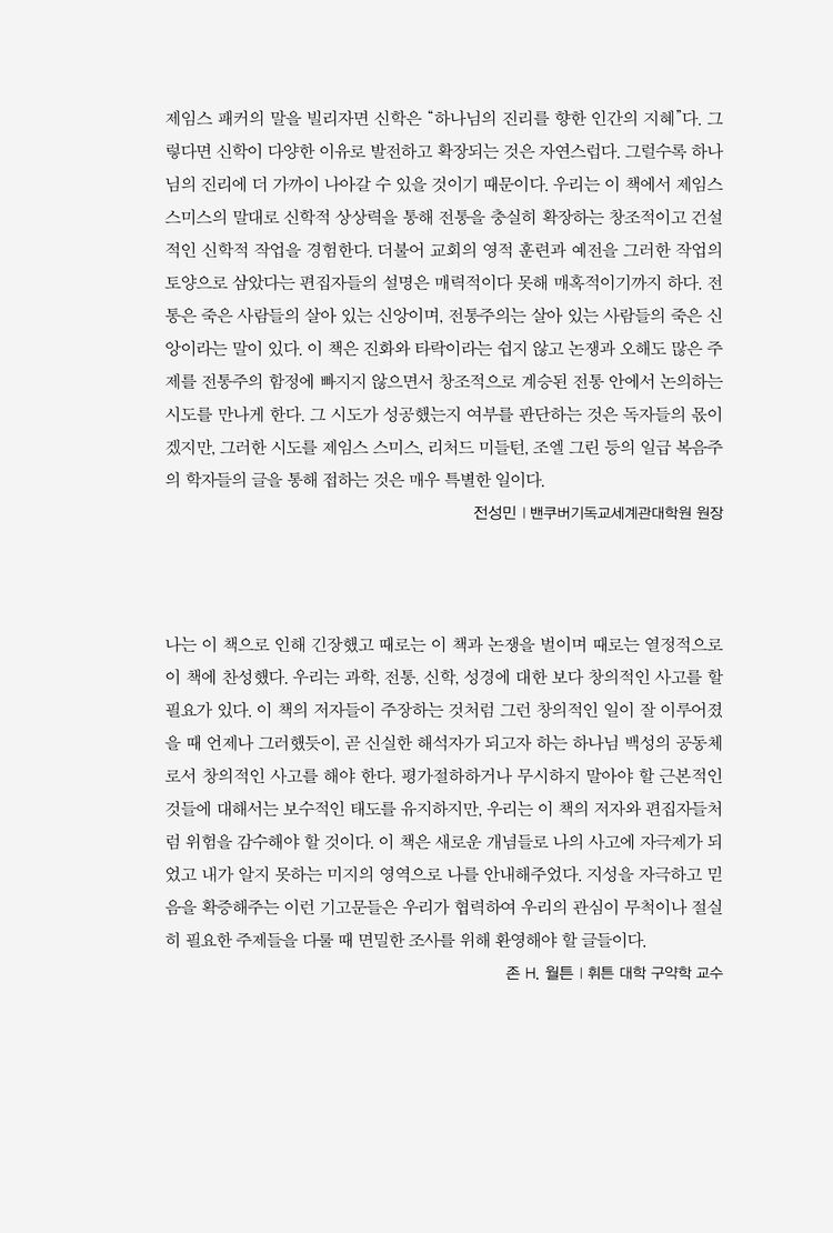우리는 과학, 전통, 신학, 성경에 대한 보다 창의적인 사고를 할 필요가 있다. 평가절하하거나 무시하지 말아야할 근본적인 것들에 대해서는 보수적인 태도를 유지하지만, 우리는 이 책의 저자와 편집자들처럼 위험을 감수해야 할 것이다. 지성을 자극하고 믿음을 확증해주는 이런 기고문들은 우리가 협력하여 우리의 관심이 무척이나 절실히 필요한 주제들을 다룰 때 면밀한 조사를 위해 환영해야 할 글들이다.