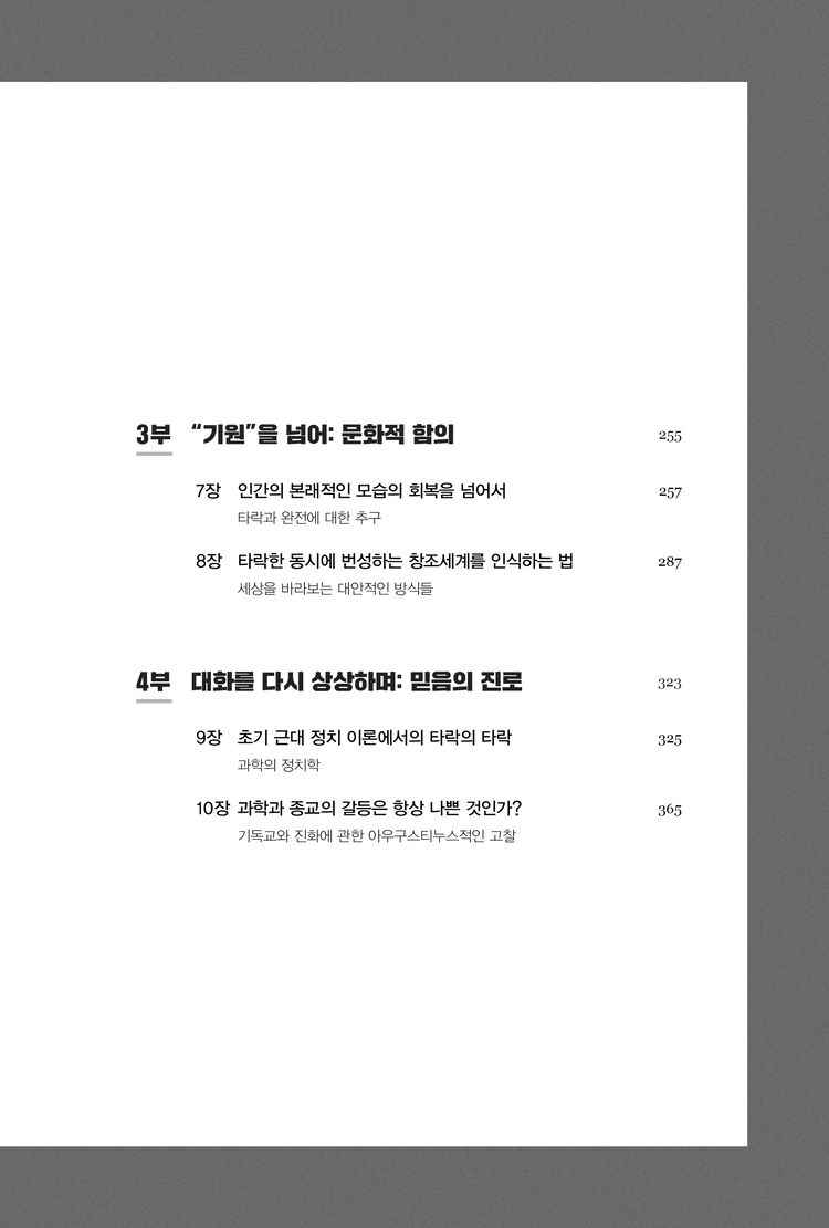 과학과 신학의 관계에 대해 더욱 생산적인 대화에 몰두하는 이들은 세속화는 과학의 불가피한 결과가 아니라는 점을 아는 게 유익하다. 앞서 했던 이야기의 손아귀에서 벗어나는 한 가지 방법은—과학의 세속화를 포함해서—세속화에 비과학적인 원인들이 있음을 보여주는 것이다. 나는 “타락”이 퇴조한 데는 과학적 뿌리가 아닌 정치적 뿌리가 있으며, 초기 근대 정치 이론에서 타락의 “자연화”(naturalization of the Fall)는 근대 국가의 출현 및 신학과 정치학의 결별, 그리고 신학과 자연과학의 결별에 기여한다는 점을 입증하고 싶다.