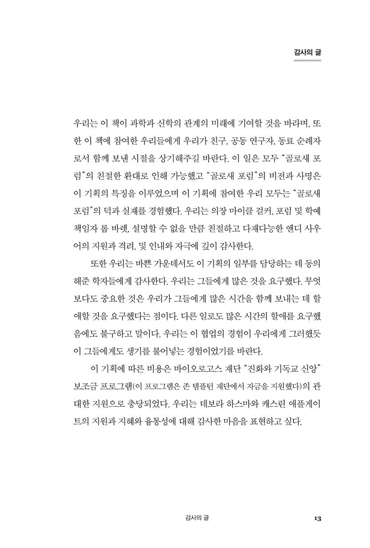 이 책은 매우 흥미로울 뿐 아니라 유익하다. 특히 진화론과 신앙의 양립 가능성을 모색하는 이들에겐 필수적이다. 진화 생물학의 도전 앞에서 낯선 땅으로 사유의 모험을 떠나고자 하는 신앙의 사유자들은 이 여행에서 이 책을 반드시 지참해야 할 것이다. 이 책이 안내서 역할을 충분히 수행할 것이기 때문이다.