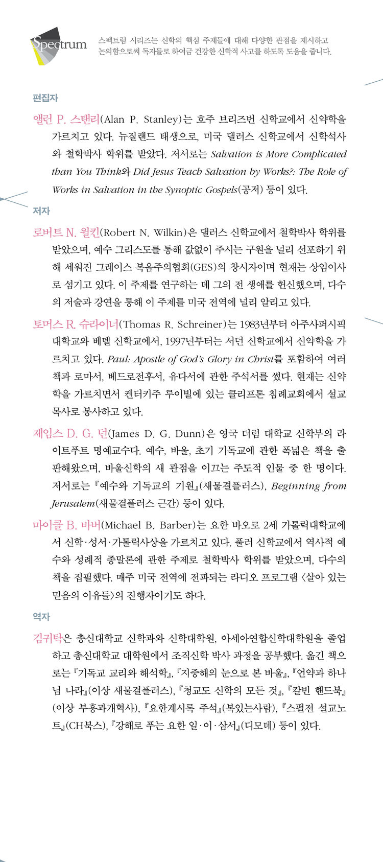 믿음으로 의롭다함을 받는 것과 행위로 심판받는다는 말씀을 어떻게 조화롭게 이해할 수 있을까? 이에 대해 수없이 많은 이견이 존재할 것이다. 이 책은 독자들로 하여금 치열한 논박의 링 위에서 적나라하게 드러나는 선수들의 강점뿐 아니라 취약점까지 쉽게 비교 평가할 수 있게 했다. 더불어 독자들 각자가 가진 견해를 더 날카롭게 다듬고 치밀하게 정비하게 돕는다.