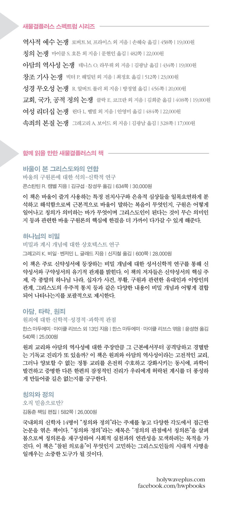 세계적인 성서학자들이 펼치는 묵직하지만 현학적이지 않고, 복잡하지만 난삽하지 않은 “미세한 주석”과 “절묘한 해석”은 종교개혁의 구호인 “오직 믿음”에 대한 철저한 오용(誤用)과 “회개와 실천의 촉구”가 졸지에 사라진 한국교회에 위기의 시그널을 보내는 것처럼 느껴진다. 성서읽기의 차이가 제공하는 관점의 다양성에 공감하는 목회자나 신학도의 경계를 넘어, 모든 그리스도인을 토론의 광장으로 이끌 촉매제인 본서의 필독을 정중히 권하는 바이다.