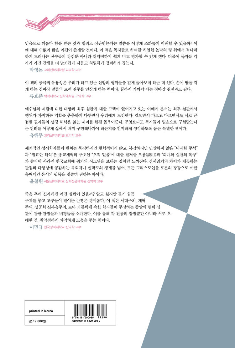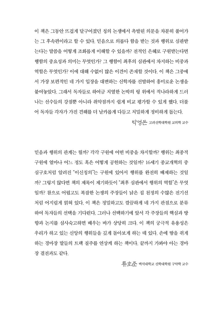 구원에 있어 믿음과 행위의 관계는 구원론에서 실로 중대한 주제 가운데 하나가 아닐 수 없다. 그러기에 서로 상이한 관점을 가진 저자들의 견해는 독자들에게 이 주제에 대한 전문적인 지식 및 안목과 더불어 이 주제에 대한 올바른 방향을 정립함에 있어 타산지석의 지혜를 제공해줄 것이다.