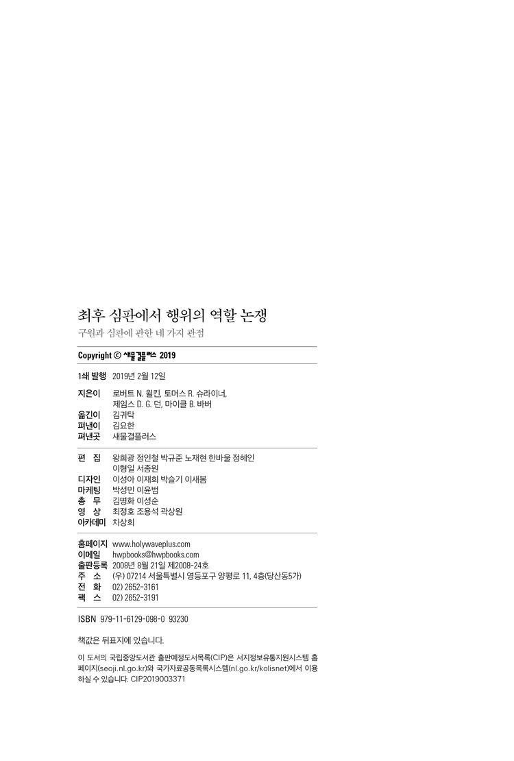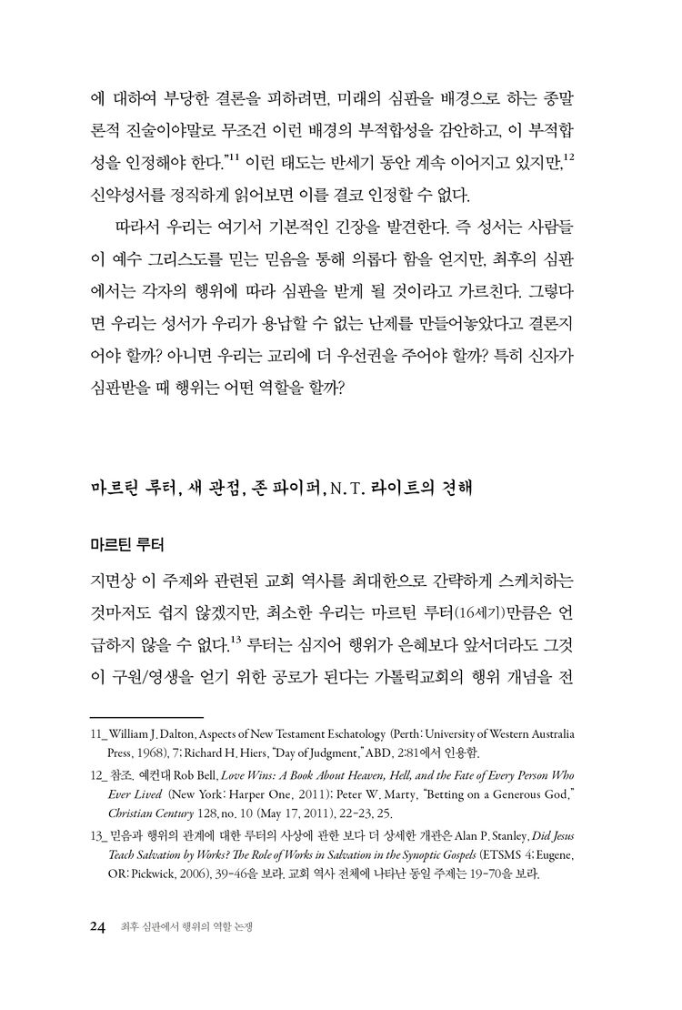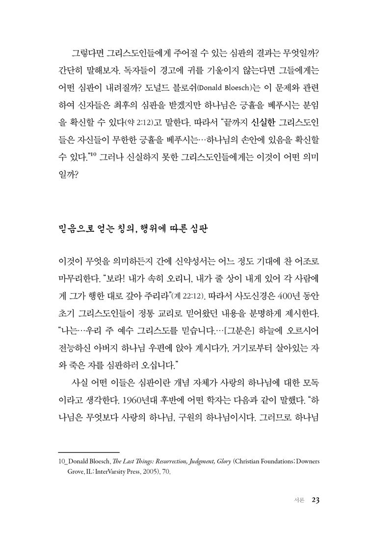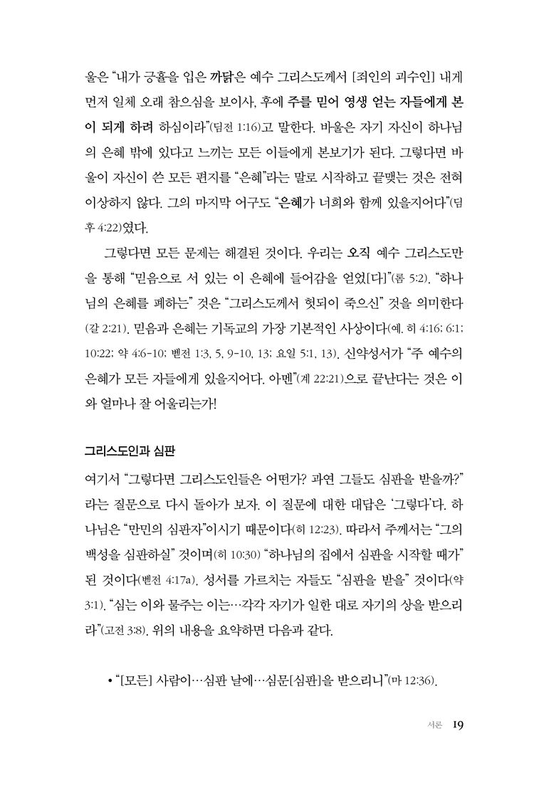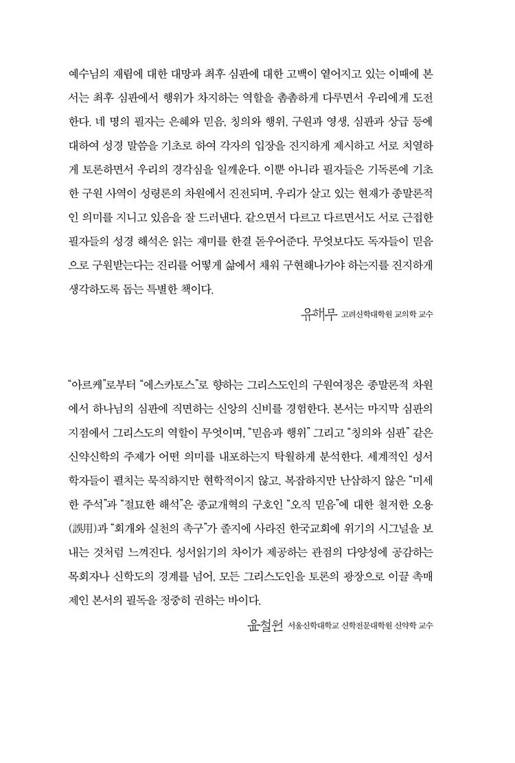 예수님의 재림에 대한 대망과 최후 심판에 대한 고백이 옅어지고 있는 이때에 본서는 최후 심판에서 행위가 차지하는 역할을 촘촘하게 다루면서 우리에게 도전한다. 같으면서 다르고 다르면서도 서로 근접한 필자들의 성경 해석은 읽는 재미를 한결 돋우어준다. 무엇보다도 독자들이 믿음으로 구원 받는다는 진리를 어떻게 삶에서 채워 구현해나가야 하는지를 진지하게 생각하도록 돕는 특별한 책이다.