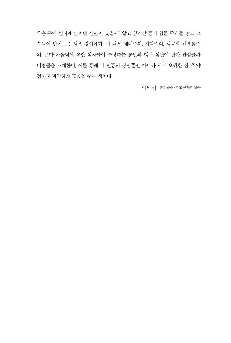 죽은 후에 신자에겐 어떤 심판이 있을까? 알고 싶지만 듣기 힘든 주제를 놓고 고수들이 벌이는 논쟁은 경이롭다. 이 책은 세대주의, 개혁주의, 성공회 신복음주의, 로마 가톨릭에 속한 학자들이 주장하는 종말의 행위 심판에 관한 관점들과 비평들을 소개한다. 이를 통해 각 전통의 장점뿐만 아니라 서로 오해한 점, 취약점까지 파악하게 도움을 주는 책이다.
