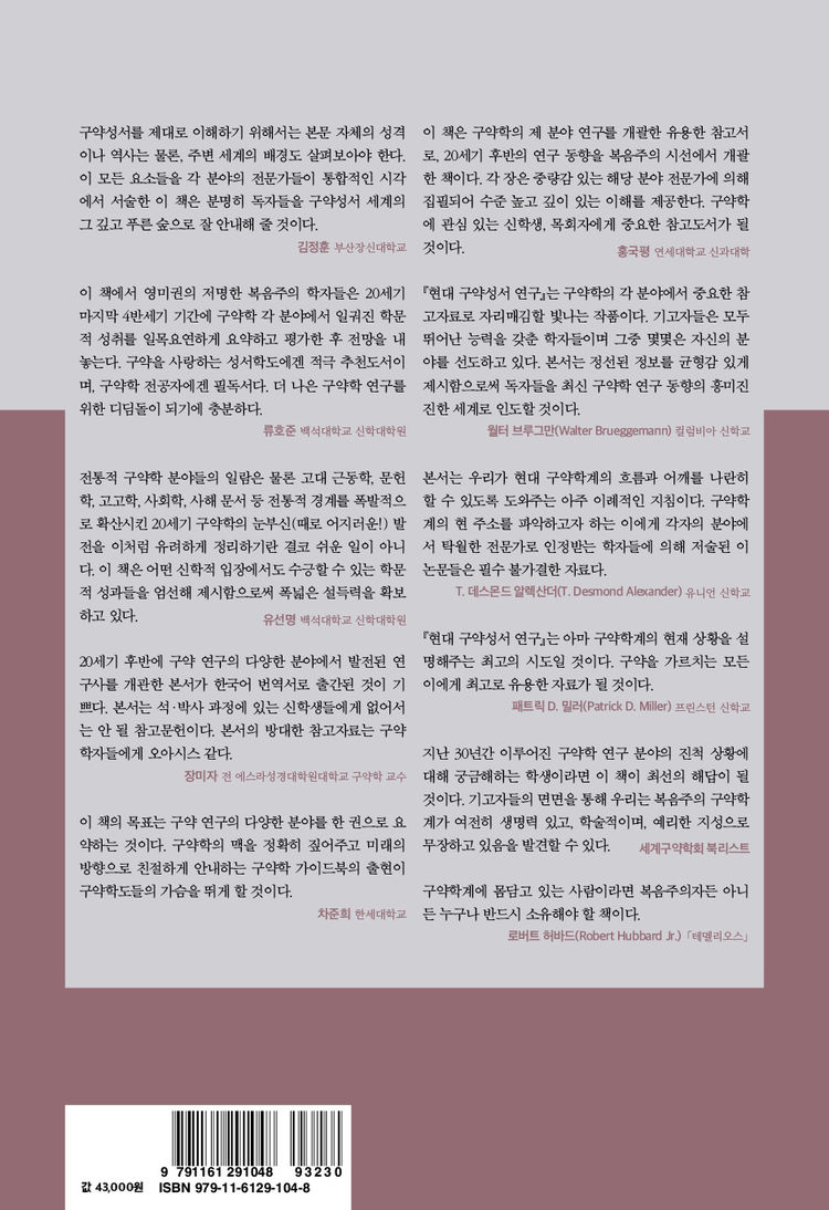『현대 구약성서 연구』는 아마 구약학계의 현재 상황을 설명해주는 최고의 시도일 것이다. 구약을 가르치는 모든 이에게 최고로 유용한 자료가 될 것이다.
