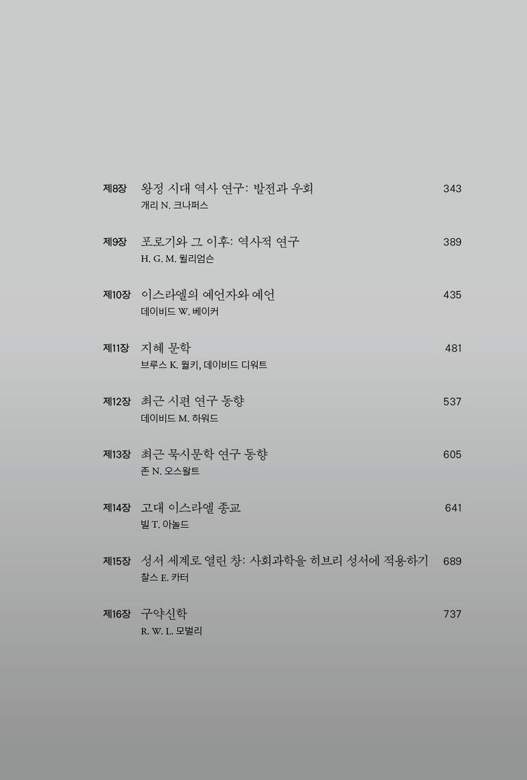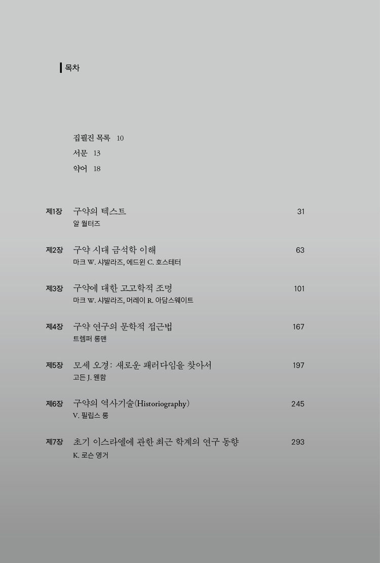전통적 구약학 분야들의 일람은 물론 고대 근동학, 문헌학, 고고학, 사회학, 사해 문서 등 전통적 경계를 폭발적으로 확산시킨 20세기 구약학의 눈부신(때로 어지러운!) 발전을 이처럼 유려하게 정리하기란 결코 쉬운 일이 아니다. 이 책은 어떤 신학적 입장에서도 수긍할 수 있는 학문적 성과들을 엄선해 제시함으로써 폭넓은 설득력을 확보하고 있다.