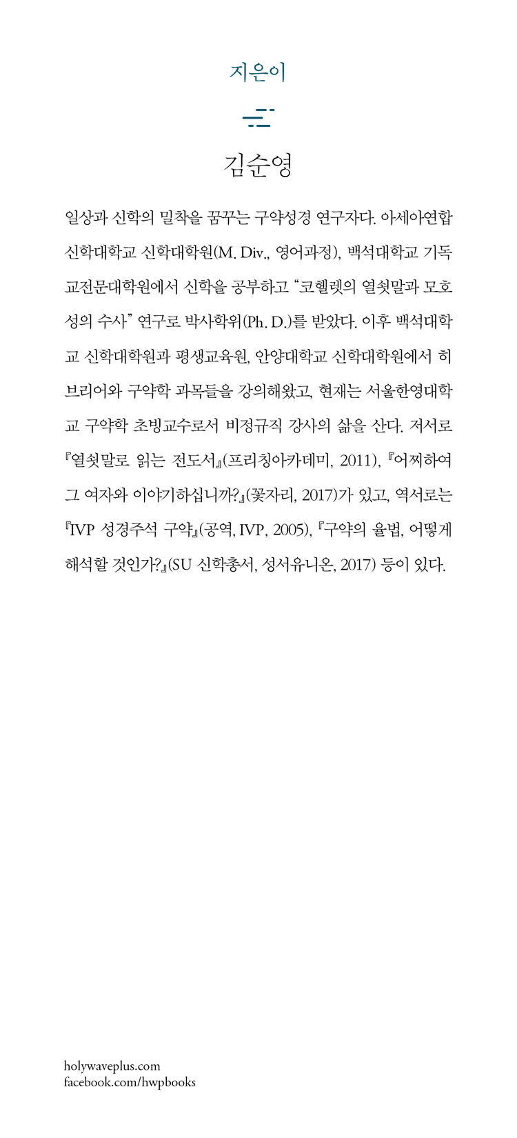 ● “코헬렛은 독자들이 가장 사소한 것들의 소중함과 그것이 선사하는 즐거움, 그리고 그 안에 숨으신 하나님의 은밀한 질서를 발견하면서 차곡차곡 쌓이는 기쁨을 누리기를 기대한다”는 저자의 전도서 해석은, 이 책을 통해 오늘의 독자에게 바라는 저자 자신의 마음으로도 읽힌다. 이 책은 세상 및 삶의 보편성과 예외성을 포괄하면서 그 의미를 새롭게 해석해가는 코헬렛을 우리 일상의 무대 위로 초대한다. 독자들은 “전도서가 현실에 뿌리를 내린 경건을 위한 가르침”이라는 저자의 주장에 쉽게 설득될 것이다. 전도서 전문가의 농익은 연구가 바탕이 되어 대중을 향하여 손짓하는 흥미 있는 책이 우리의 손에 선물과 같이 다가온다.