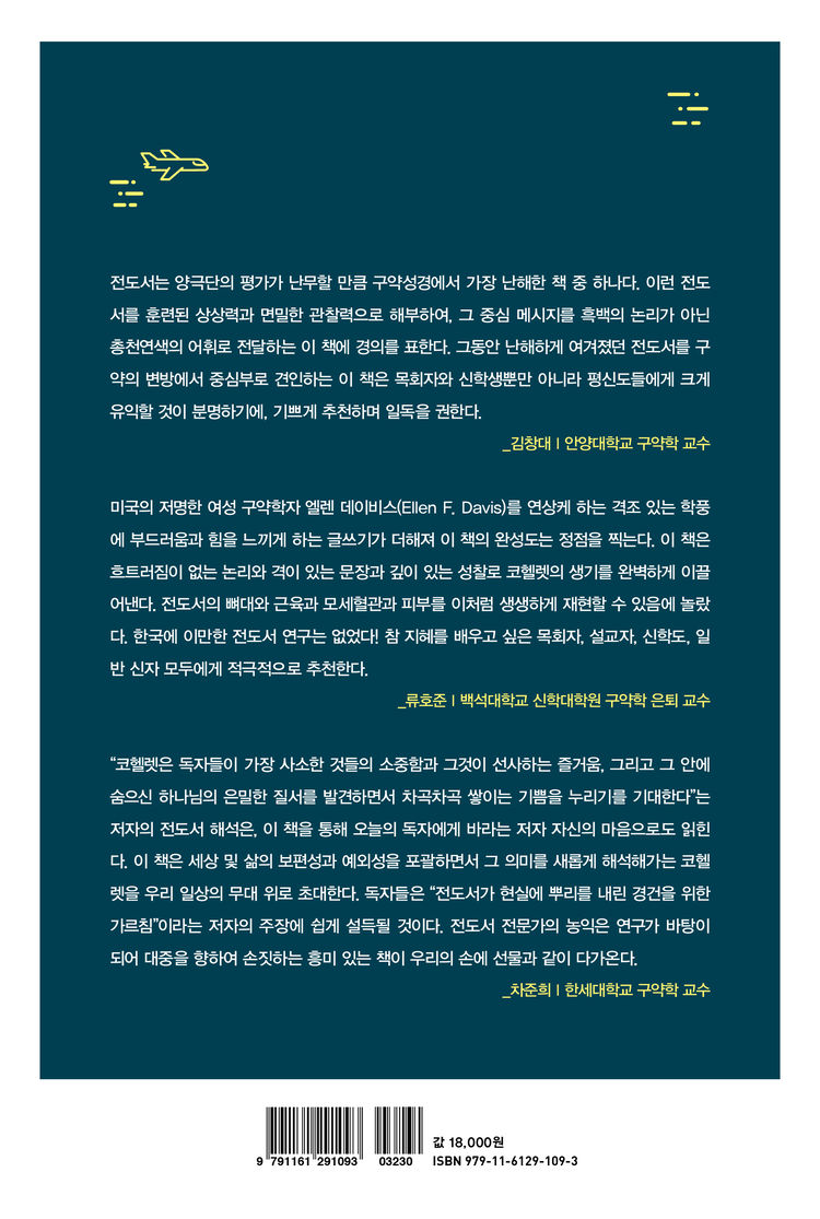 ● 미국의 저명한 여성 구약학자 엘렌 데이비스(Ellen F. Davis)를 연상케 하는 격조 있는 학풍에 부드러움과 힘을 느끼게 하는 글쓰기가 더해져 이 책의 완성도는 정점을 찍는다. 이 책은 흐트러짐이 없는 논리와 격이 있는 문장과 깊이 있는 성찰로 코헬렛의 생기를 완벽하게 이끌어낸다. 전도서의 뼈대와 근육과 모세혈관과 피부를 이처럼 생생하게 재현할 수 있음에 놀랐다. 한국에 이만한 전도서 연구는 없었다! 참 지혜를 배우고 싶은 목회자, 설교자, 신학도, 일반 신자 모두에게 적극적으로 추천한다.