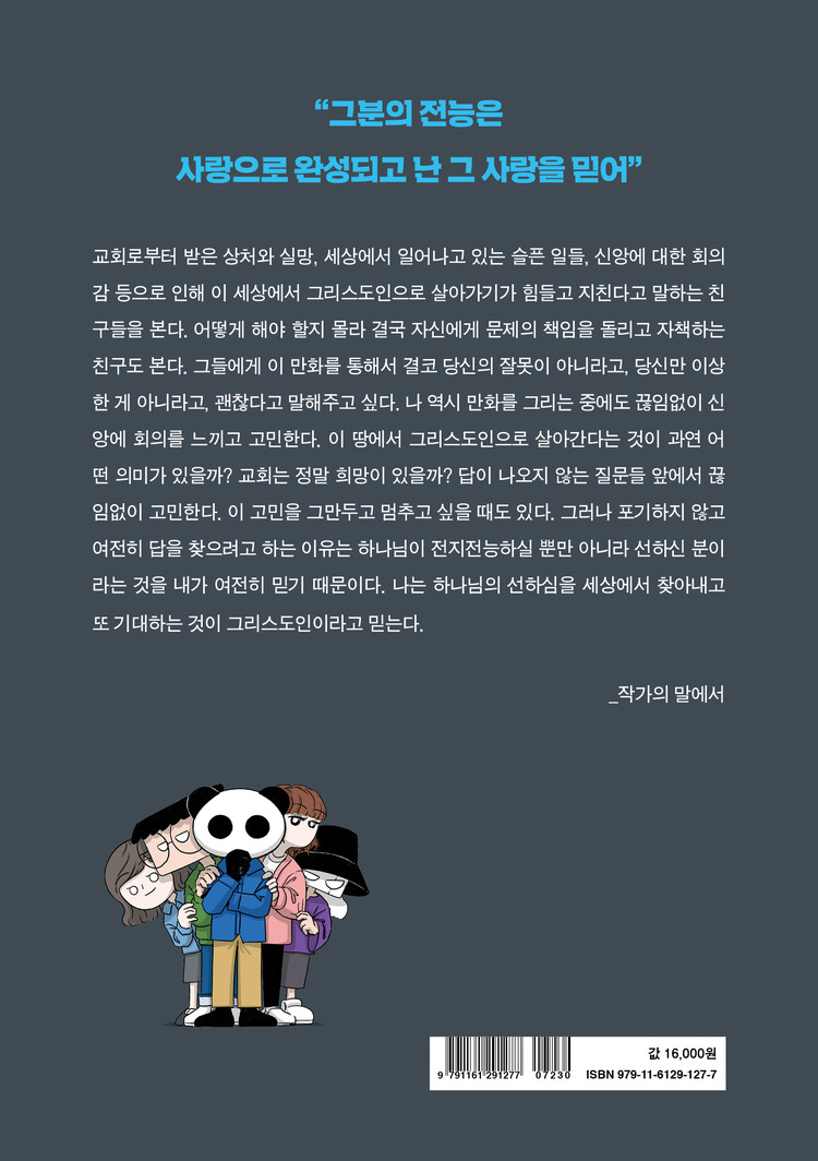 교회로부터 받은 상처와 실망, 세상에서 일어나고 있는 슬픈 일들, 신앙에 대한 회의감 등으로 인해 이 세상에서 그리스도인으로 살아가기가 힘들고 지친다고 말하는 친구들을 본다. 어떻게 해야 할지 몰라 결국 자신에게 문제의 책임을 돌리고 자책하는 친구도 본다. 그들에게 이 만화를 통해서 결코 당신의 잘못이 아니라고, 당신만 이상한 게 아니라고, 괜찮다고 말해주고 싶다. 나 역시 만화를 그리는 중에도 끊임없이 신앙에 회의를 느끼고 고민한다. 이 땅에서 그리스도인으로 살아간다는 것이 과연 어떤 의미가 있을까? 교회는 정말 희망이 있을까? 답이 나오지 않는 질문들 앞에서 끊임없이 고민한다. 이 고민을 그만두고 멈추고 싶을 때도 있다. 그러나 포기하지 않고 여전히 답을 찾으려고 하는 이유는 하나님이 전지전능하실 뿐만 아니라 선하신 분이라는 것을 내가 여전히 믿기 때문이다. 나는 하나님의 선하심을 세상에서 찾아내고 또 기대하는 것이 그리스도인이라고 믿는다.