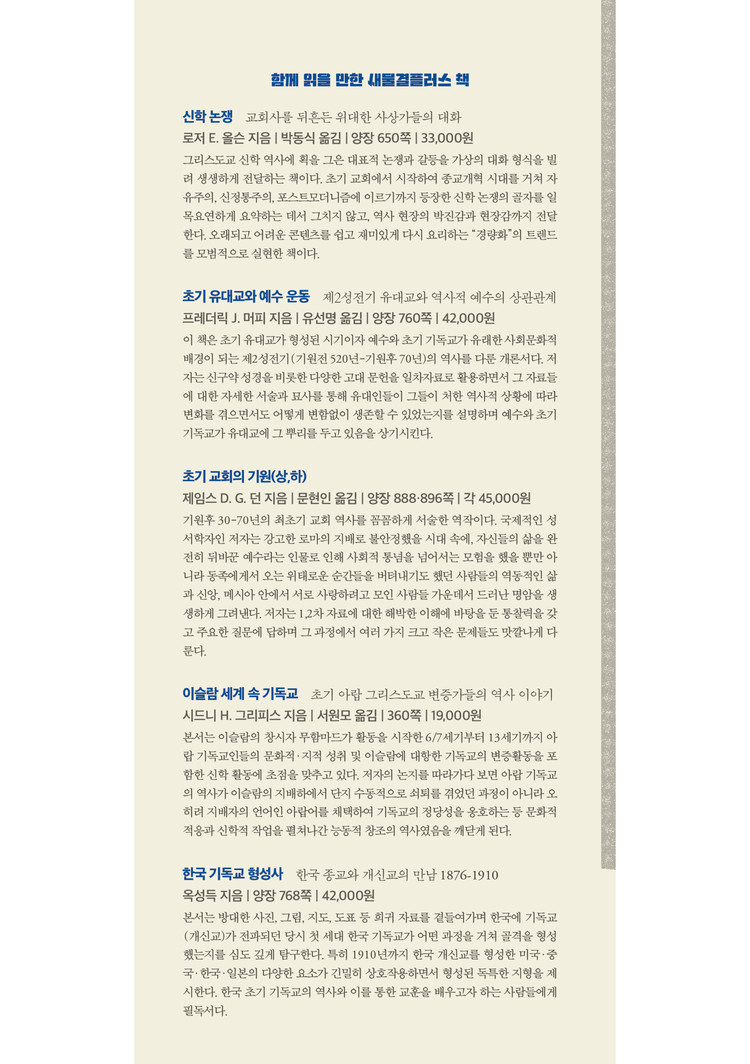 지금껏 딱딱하고 난해한 교리사 중심의 서술에 부담을 느낀 탓에 교회사 책을 멀리해온 이들이 『기독교 승리의 발자취』를 펼친다면, 1세기 초 팔레스타인에서 유대교의 미미한 소종파로 출발했던 예수운동이 오늘날 세계 최대의 종교로 성장하기까지의 과정과 동력을 시원하면서도 입체적으로 훑어가는 저자의 필치마다 역사적이고 사회적인 현실로서 살아 있는 기독교를 만나게 될 것이다. 기존의 고착화된 역사해석의 이면을 뒤집는 저자의 “새로운 관점”에 구구절절 동의하지는 않는다고 하더라도, 그동안 과학적 합리주의를 가장하며 근거 없는 허위 주장을 일삼던 얄팍한 세속 지성을 예리한 팩트 체크를 통해 무장 해제시키는 대목에서는 지적 해방감뿐 아니라 감정적 통쾌함마저 느끼게 될 것이다. 본서는 혼자서만 읽고 묵혀두기에는 참으로 아까운 책이다. 기독교에 대한 의심과 불신이 만연한 오늘날 신앙과 과학적 세계관 사이에서 머뭇거리는 이들, 기독교의 본질과 가치에 대해 마음을 닫아버린 이들, 더 나아가 과학적 세계관을 맹신하며 기독교 신앙을 폄하하는 이들과 함께 이 책을 읽으면서 밤을 지새우는 지적 희열을 느껴보는 것은 어떨까?