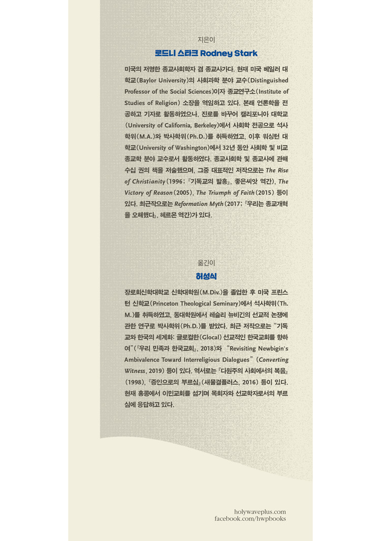 저자인 로드니 스타크는 미국 종교사회학계를 주도하는 거장으로서 사회과학적 이론과 방법을 적용하여 2천년 기독교 역사의 주요 국면을 재조명한다. 아울러 기존의 고착화된 역사 해석에 도전하는 “새로운 관점”을 통해 오랫동안 왜곡되어온 진실을 예리하게 파헤친다. 종교사회학자의 손에 들린 편향되지 않은 사회과학의 무기를 통해 해체되는 대상은 놀랍게도 과학적 합리주의를 가장한 반기독교적 허위 주장 내지 과장된 왜곡인 반면에, 역으로 그 진가가 새롭게 드러나는 것은 성경의 역사적 신빙성, 기독교의 성장이 가져다준 인간 삶과 문명의 실질적 진보 및 기독교적 세계관이 지닌 견실함이다. 기독교 승리의 발자취는 한마디로 말해 사회과학 편에서 무심결에 던져준 선물 곧 기독교 복음에 대한 참신하고 흥미로운 변증이라고 하겠다.