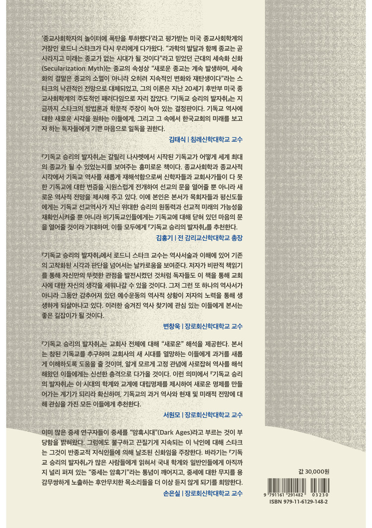 종교사회학자인 로드니 스타크는 이천 년 기독교 역사를 “역사적이고 사회학적인” 관점에서 다룬다. 그는 기독교에 대한 부정적 신념이 팽배하고 근거 없는 비난이 난무하는 현대 사회에서 간과되기 쉬운 측면, 즉 기독교가 인류문명에 가져온 공헌에 초점을 맞춘다. ··· 이미 많은 중세 연구자들이 중세를 “암흑시대”(Dark Ages)라고 부르는 것이 부당함을 밝혀왔다. 그럼에도 불구하고 끈질기게 지속되는 이 낙인에 대해 저자는 그것이 반종교적 지식인들에 의해 날조된 신화임을 주장한다. 바라기는 『기독교 승리의 발자취』가 많은 사람들에게 읽혀서 국내 학계와 일반인들에게 아직까지 널리 퍼져있는 “중세는 암흑기”라는 통념이 깨어지고, 중세에 대한 무지를 용감무쌍하게 노출하는 후안무치한 목소리들을 더 이상 듣지 않게 되기를 희망한다. 아울러 번역서임에도 돋보이는 유려한 문체가 독서의 기쁨을 더하리라 확신한다.