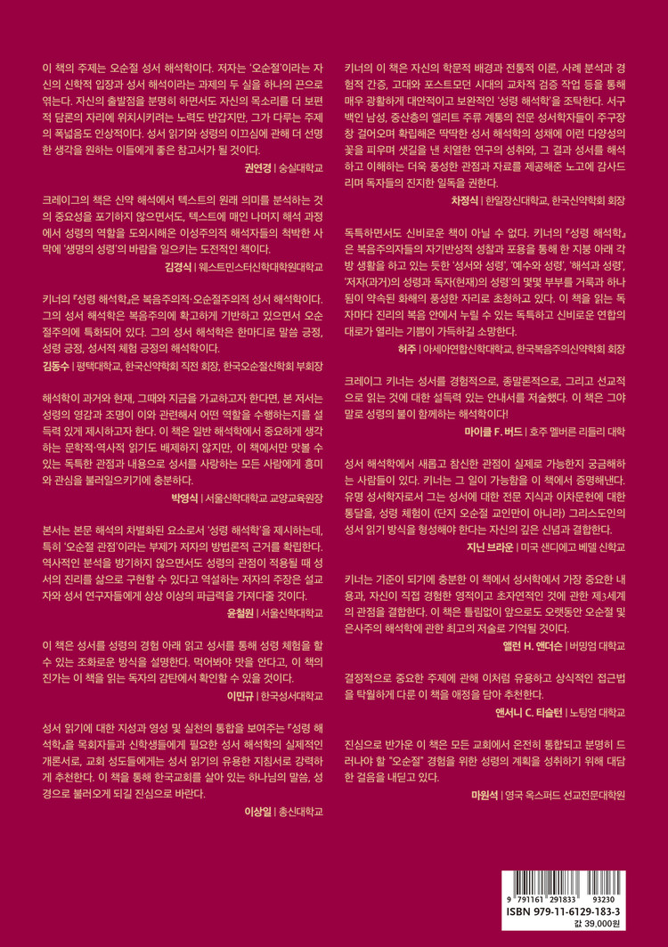 크레이그 키너는 성서를 경험적으로, 종말론적으로, 그리고 선교적으로 읽는 것에 대한 설득력 있는 안내서를 저술했다. 이 책은 그야말로 성령의 불이 함께하는 해석학이다!