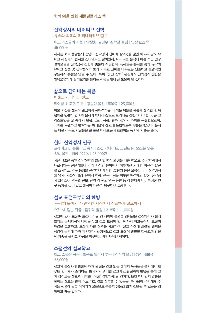 한국복음주의신약학회에 소속된 교수님들이 신약성경 각 권의 말씀을 본문으로 풀어 설교한 내용을 모아 책으로 출간하게 된 것은 참으로 귀한 시도다. 신학자들의 노고와 연구물이 사람을 살리고 공동체를 세움으로써 세상 속에 침투해 들어가 각자의 역할을 감당하는 교회를 세우는 일을 위해 하나님의 손에 들려 더욱 온전히 사용되길 기도한다.