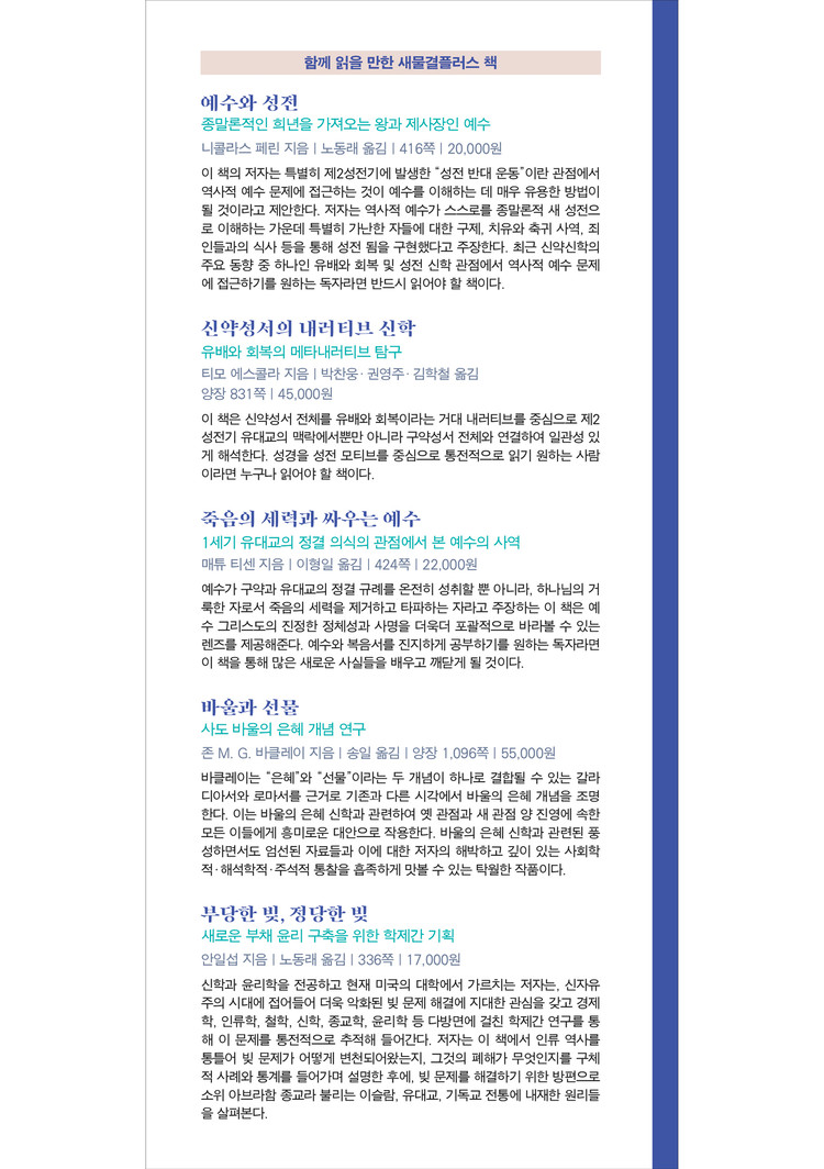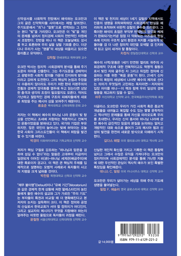 신약성서를 사회학적 전망에서 해석하는 오크만과 그의 글은 신약학자들 사이에서는 제법 알려졌다. 주기도문에서 “죄”나 “잘못”으로 번역되는 그 단어는 본디 “빚”을 가리켰다. 오크만은 이 “빚”을 개인의 문제를 넘어서 정치경제 사회의 전반적인 차원에서 조망한다. 찬반을 떠나 이 책은 오늘날에도 성서를 두고 토론하며 우리 삶을 살필 기회를 준다. 더군다나 우리가 사는 “영끌”의 세상을 떠올리고 읽으면 흥미롭고 유익하다.