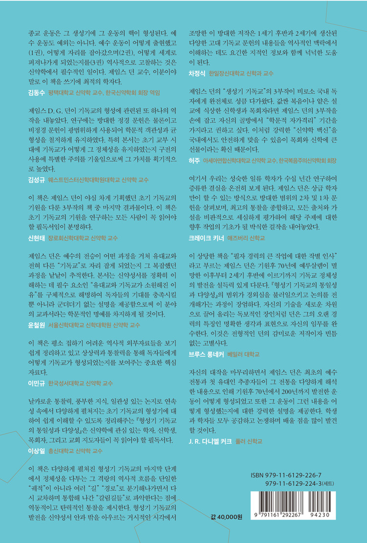 이 상당한 책을 “필자 경력의 큰 작업에 대한 작별 인사”라고 부르는 제임스 던은 기원후 70년에 예루살렘이 멸망한 이후부터 2세기 후반에 이르기까지 기독교 정체성의 발전을 설득력 있게 다룬다. 『형성기 기독교의 통일성과 다양성』의 범위가 경외심을 불러일으키고 논의를 전개해가는 과정이 장엄하다. 자신의 기술을 새로운 차원으로 끌어 올리는 독보적인 장인처럼 던은 그의 오랜 경력의 특징인 명확한 생각과 표현으로 자신의 임무를 완수한다. 이것은 전형적인 던의 감미로운 저작이자 빈틈없는 고별사다.