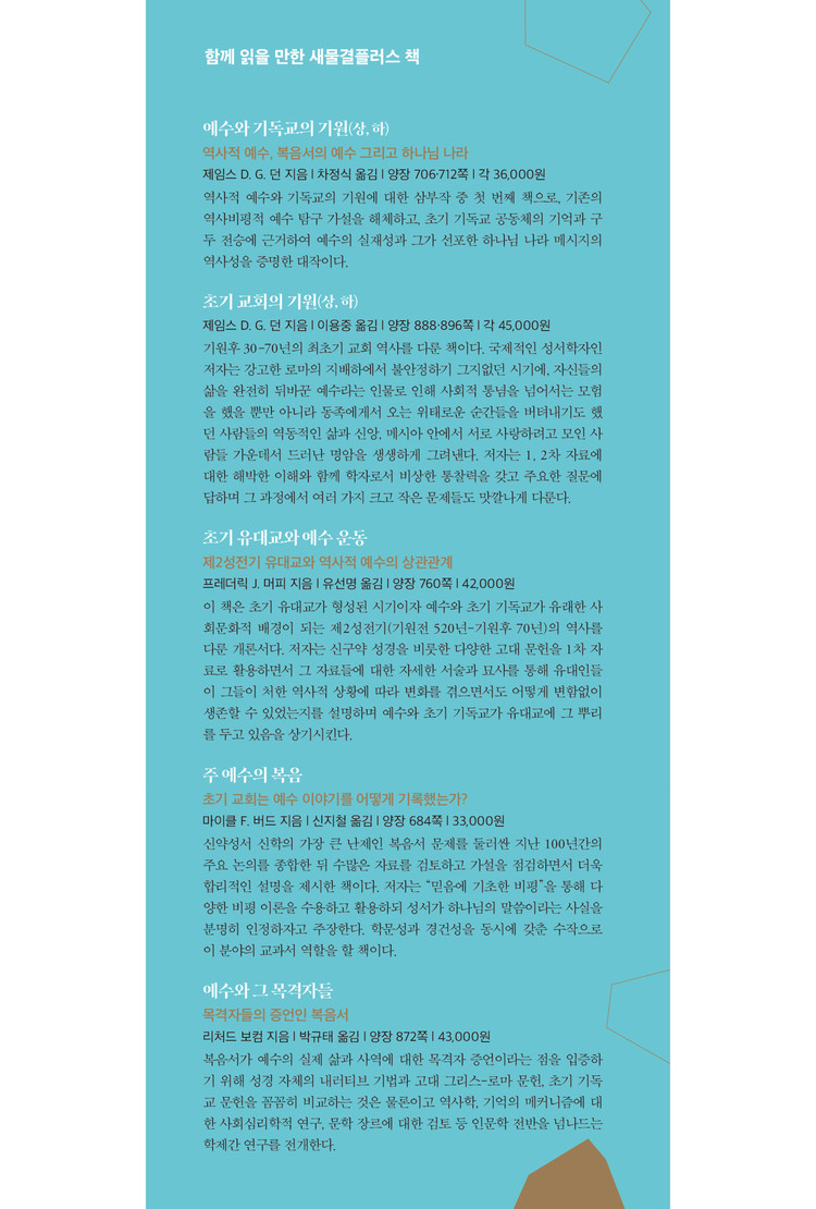 이 책은 평소 접하기 어려운 역사적 외부자료들을 보기 쉽게 정리하고 있고 상상력과 통찰력을 통해 독자들에게 어떻게 기독교가 형성되었는지를 보여주는 중요한 핵심자료다.