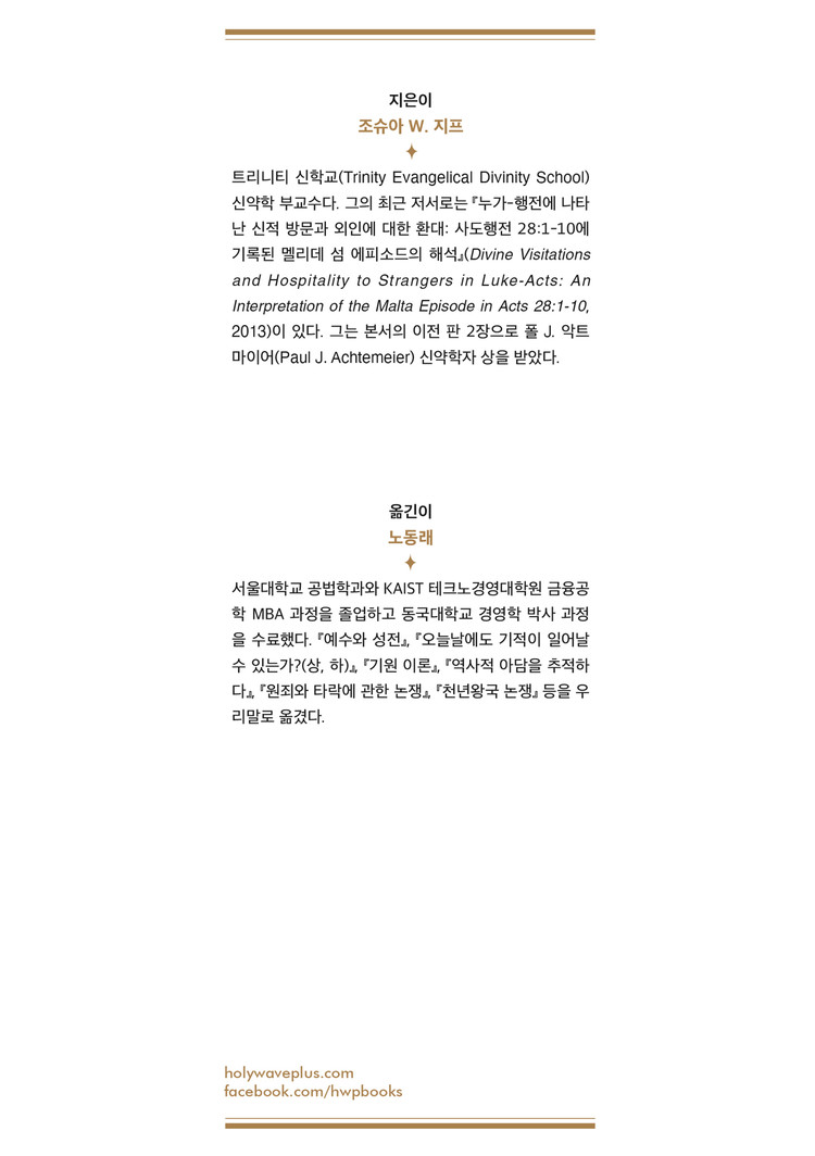 트리니티 신학교(Trinity Evangelical Divinity School) 신약학 부교수다. 그의 최근 저서로는 누가-행전에 나타난 신적 방문과 외인에 대한 환대: 사도행전 28:1-10에 기록된 멜리데 섬 에피소드의 해석』(Divine Visitations and Hospitality to Strangers in Luke-Acts: An Interpretation of the Malta Episode in Acts 28:1-10, 2013)이 있다. 그는 본서의 이전 판 2장으로 폴 J. 악트마이어(Paul J. Achtemeier) 신약학자 상을 받았다.