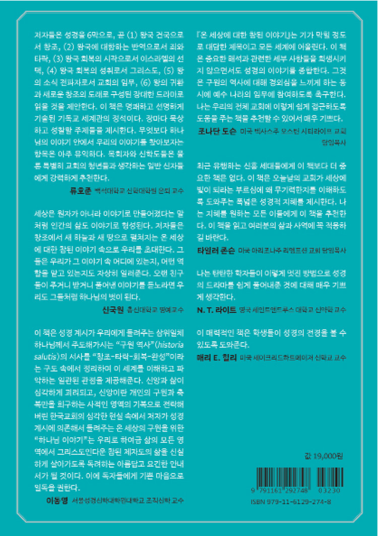 이 책은 성경 계시가 우리에게 들려주는 삼위일체 하나님께서 주도해가시는 “구원 역사”(historia salutis)의 서사를 “창조-타락-회복-완성”이라는 구도 속에서 정리하여 이 세계를 이해하고 파악하는 일관된 관점을 제공해준다. 신앙과 삶이 심각하게 괴리되고, 신앙이란 개인의 구원과 축복만을 희구하는 사적인 영역의 기복으로 전락해버린 한국교회의 심각한 현실 속에서 저자가 성경 계시에 의존해서 들려주는 온 세상의 구원을 위한 “하나님 이야기”는 우리로 하여금 삶의 모든 영역에서 그리스도인다운 참된 제자도의 삶을 신실하게 살아가도록 독려하는 아름답고 요긴한 안내서가 될 것이다. 이에 독자들에게 기쁜 마음으로