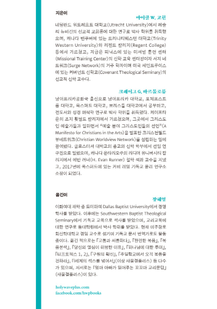 최근 유행하는 신흥 세대들에게 이 책보다 더 중요한 책은 없다. 이 책은 오늘날의 교회가 세상에 빛이 되라는 부르심에 왜 무기력한지를 이해하도록 도와주는 폭넓은 성경적 지혜를 제시한다. 나는 지혜를 원하는 모든 이들에게 이 책을 추천한다. 이 책을 읽고 여러분의 삶과 사역에 꼭 적용하길 바란다.