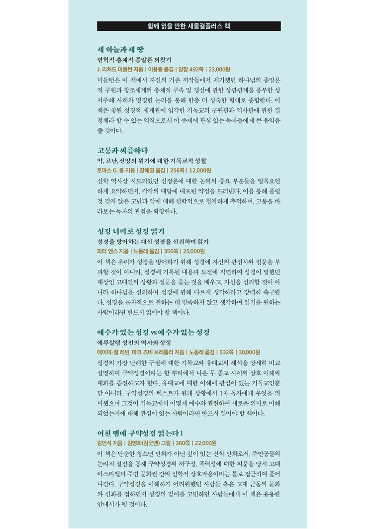 리처드 미들턴은 성서를 읽는 익숙한 방식에 의문을 제기하며, 견고하게 쌓인 논리 구조 속에서 낯선 시선을 끌어내려 노력한다. 하나님의 축복과 심판 앞에서 인간은 감사와 탄원이라는 방식으로 응답해 왔다. 수많은 신앙인에게 모범으로 제시되어 온 아브라함의 침묵, 그리고 하나님의 질문 앞에서 보여주는 욥의 침묵. 저자는 “침묵”이라는 주제를 통해 익숙한 독법에 근본적인 물음을 던진다. 침묵 가운데 하나님의 명령을 수행한 아브라함은 진정한 순종자였을까, 아니면 탄식하는 인간이었을까? 저자는 이러한 물음을 통해 독자들의 시선을 잠시 “하나님”이 아닌 “인간”에게 돌리기를 요청한다. 미들턴의 질문은 여기서 멈추지 않는다. 그는 한 걸음 더 나아가 “고통”이라는 보다 근원적인 문제에 다가가고자 한다. 어쩌면 인간의 침묵은 자신을 숨기시는 하나님의 침묵에 대응하는 방식인지도 모른다. 이 책의 페이지를 넘기는 순간, “웅변은 은이요, 침묵은 금이다”라는 경구(警句)는 잠시 접어두게 될 것이다.