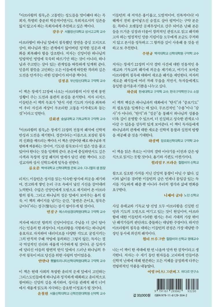 『아브라함의 침묵』은 창세기 22장의 전통적 해석에 신학적 반성과 도전을 제기한다. 경건이라는 이름으로 포장된 침묵의 신화를 깨뜨리는 책이다. 아브라함의 침묵이 과연 믿음의 완성인가? 미들턴은 이 물음 앞에 신중하면서도 대담한 신학적 해석을 들고나온다. 그는 욥기, 시편, 예언서 속 “하나님께 말 걸기”의 경건한 전통을 회복하면서, 하나님은 단지 순종만을 원하시는 분이 아니라 정직한 항의와 탄식을 기꺼이 들어주시는 분임을 설득력 있게 보여준다. 이 책은 신앙이란 때로 하나님과 격렬하게 씨름하는 것이며, 기도란 침묵보다 더 많은 말을 품고 있어야 한다는 것을 일깨워 준다. 이러한 접근은 성경 본문을 바르게 해석하려는 학문적 성실성과 동시에 신학적 상상력을 균형 있게 보여준다. 특히 욥기 해석은 “바른말”이란 무엇인가에 대한 깊은 성찰을 이끌어준다. 경건과 복종이라는 이름으로 침묵을 미화하거나 강요해 온 한국교회에 중요한 신학적 자극과 성찰을 제공할 것이다. 본문에 충실하면서도 깊은 사색과 독창적 성경 해석의 열매가 담긴 귀한 책이다. 그러기에 꼭 곁에 두고 천천히, 그러나 진지하게 읽으시라. 개인적 생각으로는 월터 브루그만의 그림자가 깊게 드리운 책이기도 하다. 모든 설교자와 성서 신학도에게 일독을 권한다.